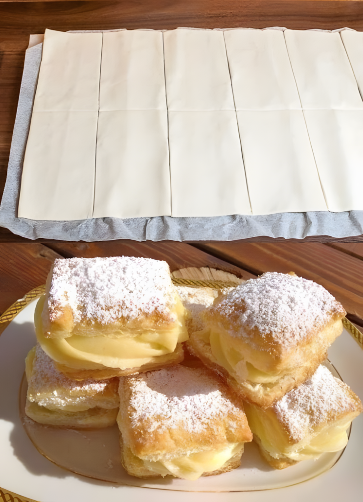 (Delikatne ciasto z kremowym wnętrzem – proste i pyszne jak u babci) Składniki: 1 opakowanie ciasta francuskiego (250 g) 1 opakowanie budyniu waniliowego (najlepiej klasycznego, bez cukru) 500 ml mleka