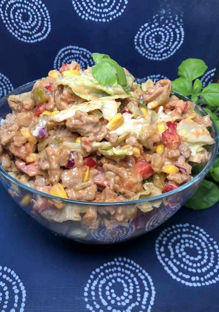 Opis: Ta sałatka z mielonym mięsem to idealna propozycja na imprezę, spotkanie ze znajomymi lub po prostu na sycącą kolację. Bogactwo smaków i aromatów, a także prostota wykonania sprawiają, że