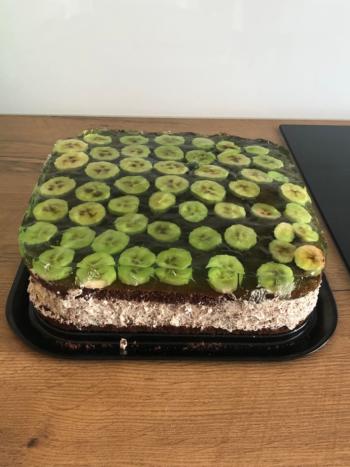 Ciasto bananowa straciatella to bardzo smaczny deser, który musicie wypróbować. Składa się z puszystego biszkopta kakaowego, puszystego kremu śmietankowego z kawałkami czekolady oraz banana zatopionego w galaretce.