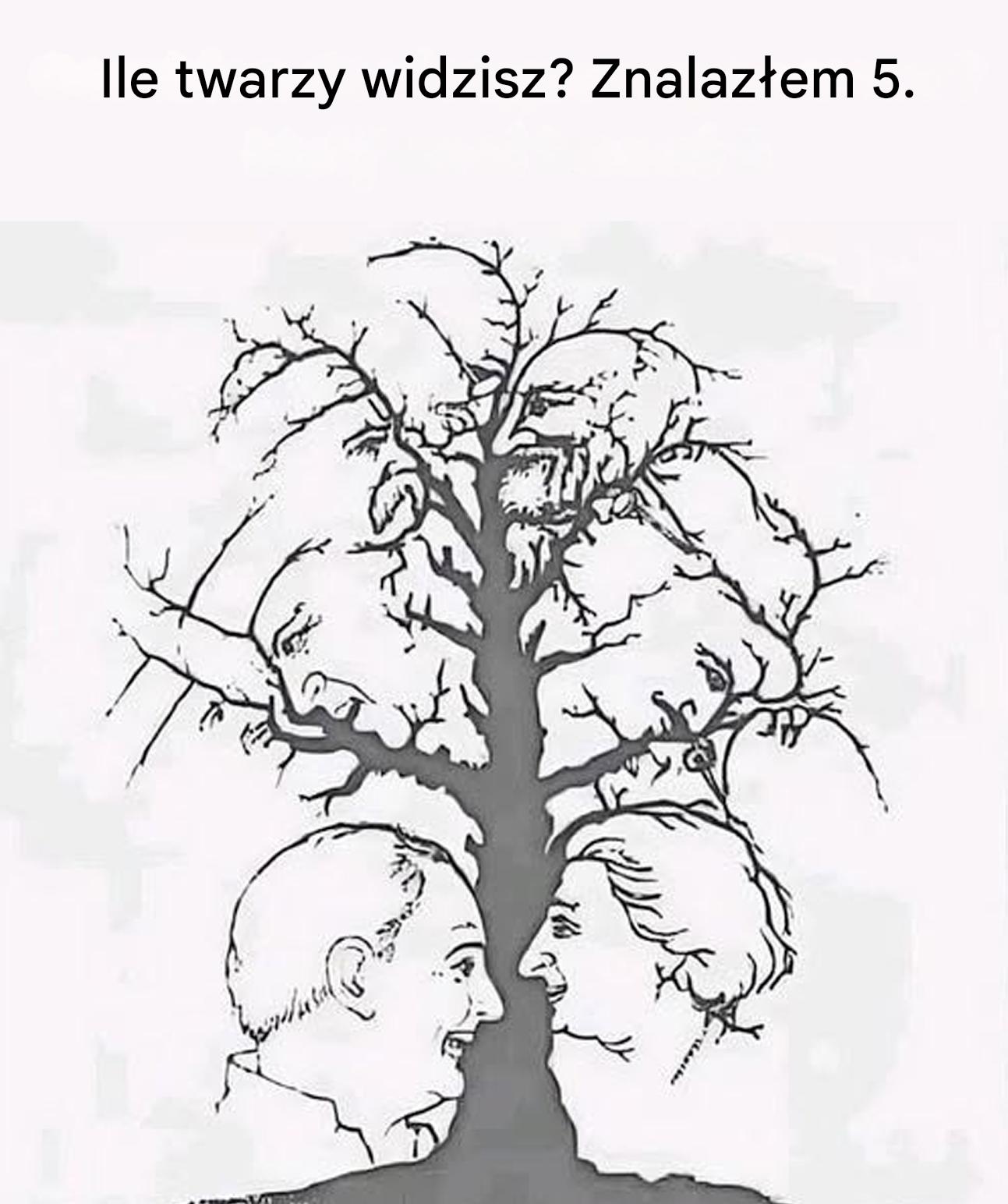 Ile twarzy widzisz na tym drzewie? Jedną? Dwie? A może cztery? Możesz być zaskoczony! Jeśli iluzja optyczna już Cię zaskoczyła, to nie jesteś sam. Ale jeśli uważasz, że to zbyt proste, przygotuj się na wyzwanie na zupełnie nowym poziomie. Następne pytanie jest trudniejsze: czy potrafisz nazwać je wszystkie?