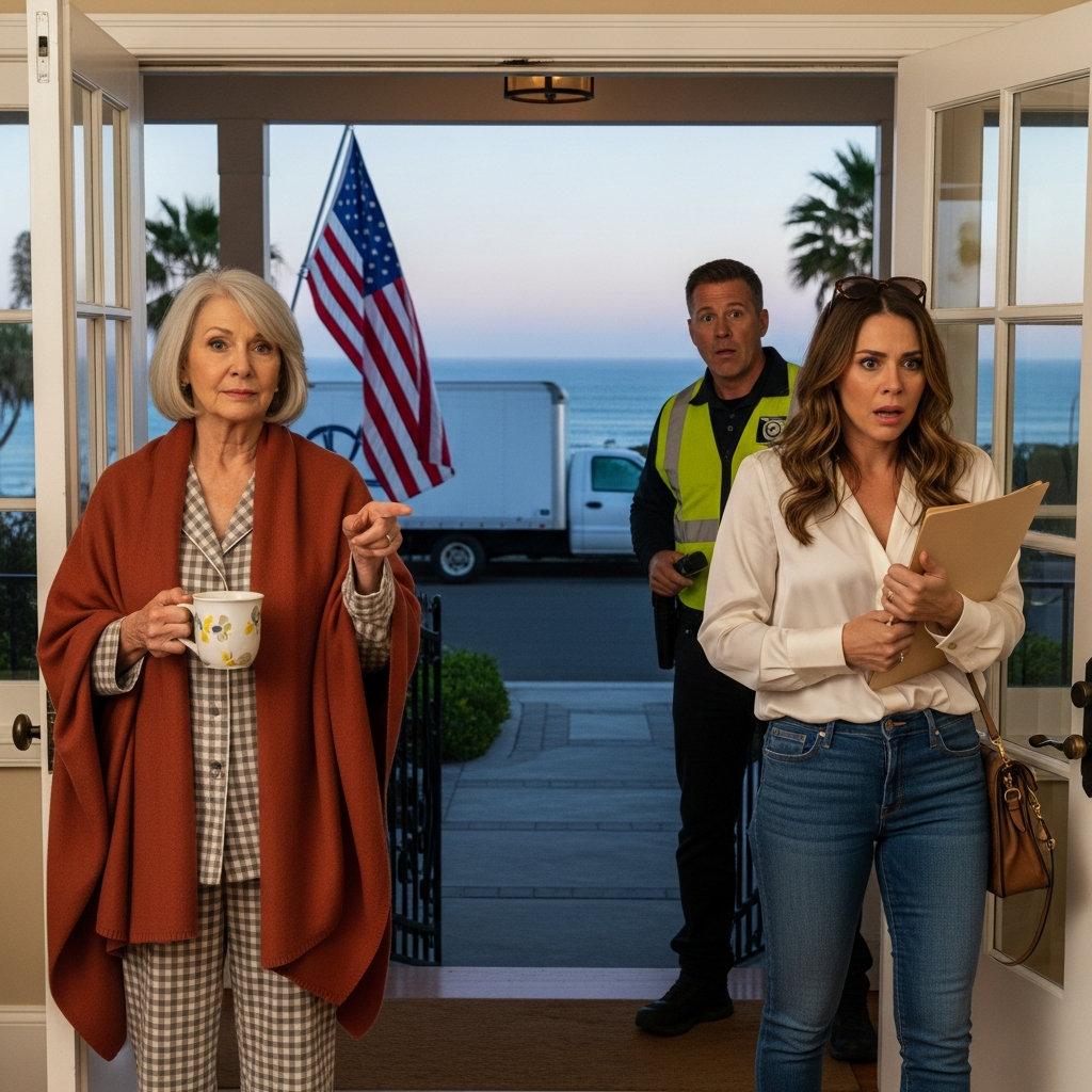 „Pani Bishop” – powiedział bez tchu. „Przepraszam, że panią tak niepokoję. Pani synowa jest przy bramie… z ekipą przeprowadzkową. Mówi, że jest nową właścicielką domu”.