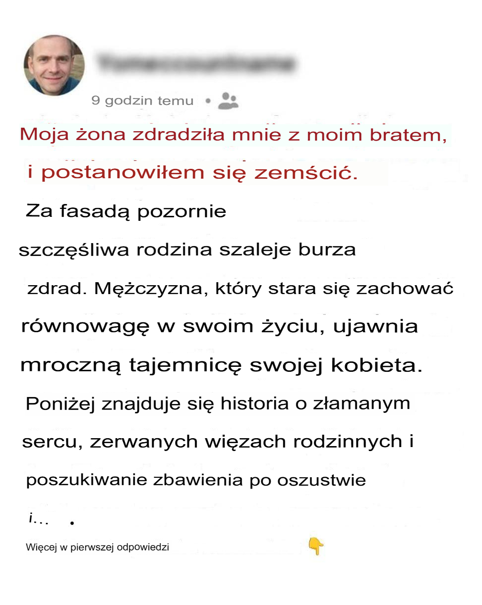 Moja żona i ja jesteśmy małżeństwem od ośmiu lat. Mamy dwójkę dzieci i na pierwszy rzut oka wyglądamy na szczęśliwą parę. Ale niedawno dowiedziałem się, że zdradziła mnie z moim bratem.