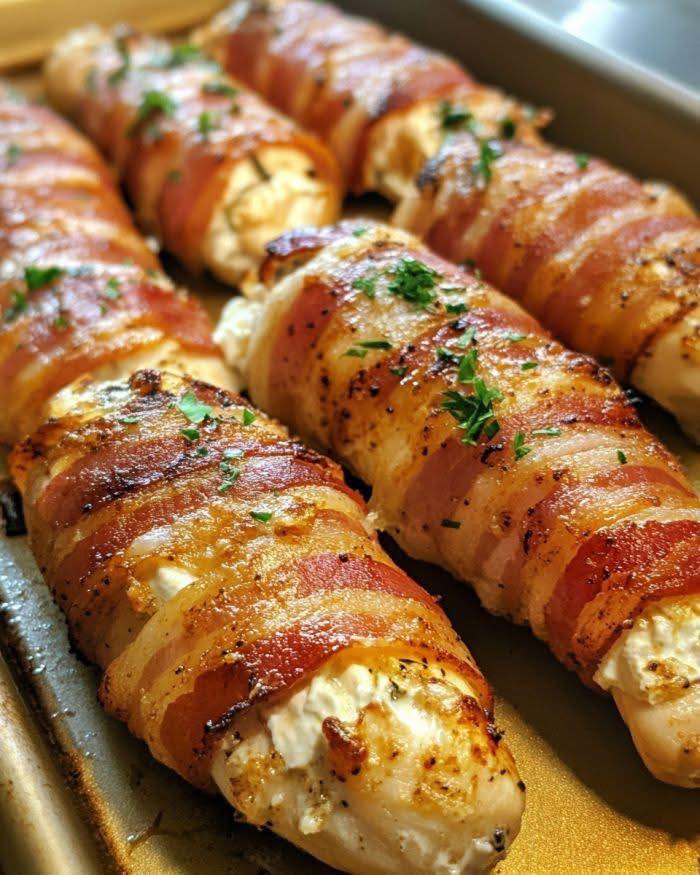 Składniki: 2 duże piersi z kurczaka 6–8 cienkich plastrów boczku wędzonego 100 g żółtego sera (np. gouda, cheddar) 1 mała cebula