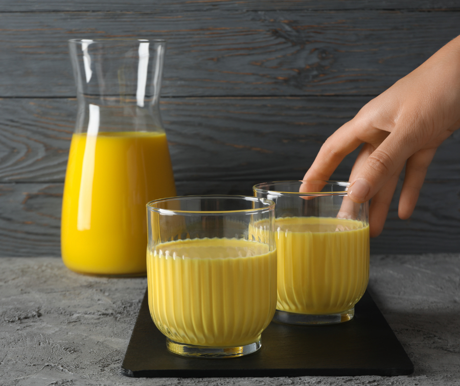 Umieść wszystkie składniki w blenderze: mleko migdałowe, marchewkę, kurkumę, imbir.