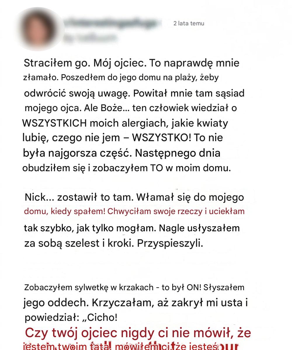 Początkowo zbagatelizowałam to jako dziwny zbieg okoliczności. Ale kiedy zmienił poduszki, żeby nie wywołać u mnie alergii na pyłki i uzupełnił lodówkę moimi ulubionymi owocami, zaczęłam się niepokoić. Wiedział za dużo.