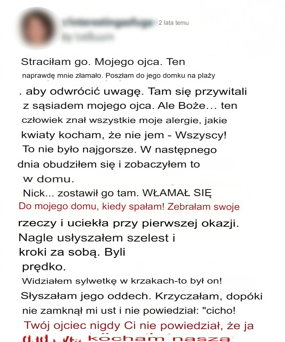 Po śmierci ojca wynajęłam dom na plaży w cichym nadmorskim miasteczku, gdzie zawsze odpoczywał od miejskiego zgiełku. Chciałam, żeby to była uzdrawiająca podróż – sposób na poczucie się bliżej człowieka, który mnie wychował. Dom był dokładnie taki, jak go opisał: ciepły, spokojny i otoczony kwitnącymi kwiatami.
