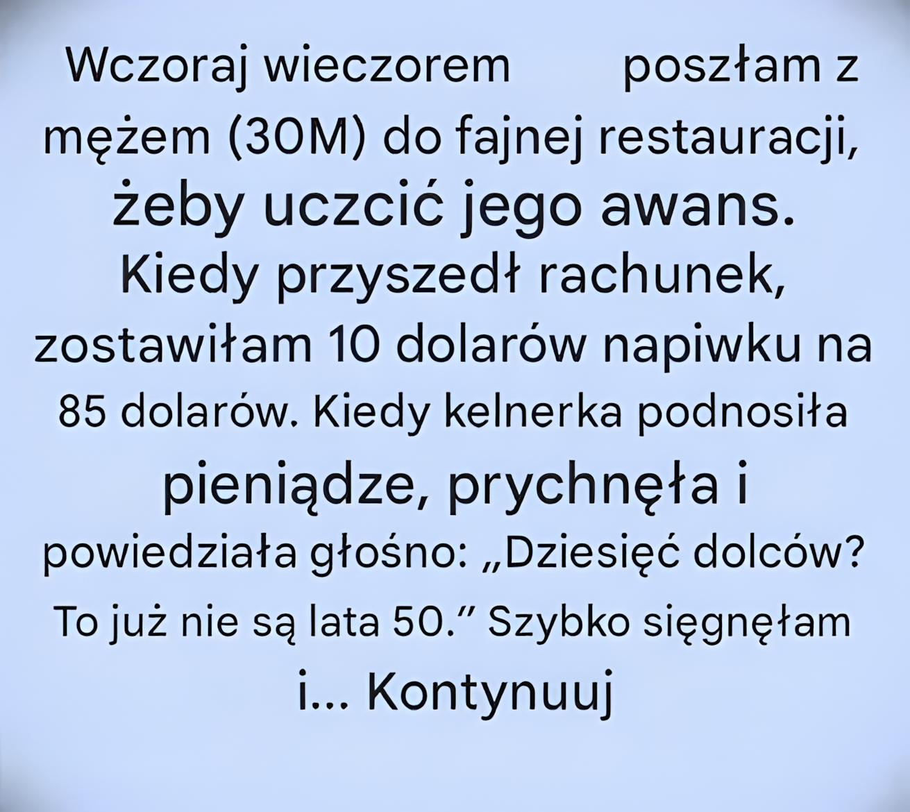 Kiedy przyszedł rachunek, zostawiłem 10 dolarów napiwku na 85 dolarów. Kiedy kelnerka podnosiła pieniądze, prychnęła i powiedziała głośno: „Dziesięć dolców? To już nie są lata 50., wiesz?”