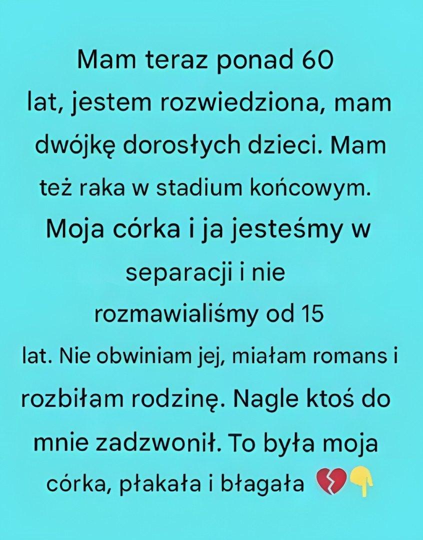 Walczę również z nowotworem w zaawansowanym stadium. Moja córka i ja nie rozmawialiśmy od 15 lat — jesteśmy skłóceni.